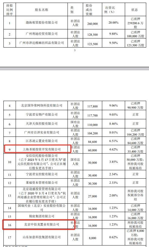 一年后的第二轮增资,将注册资本进一步推高至130亿元。渤海金控依旧以20%的持股比例稳坐第一大股东之位,而北京中佰龙置业的股权占比则进一步缩水至1.23%,彻底沦为小股东。